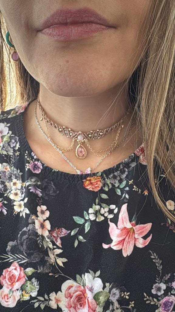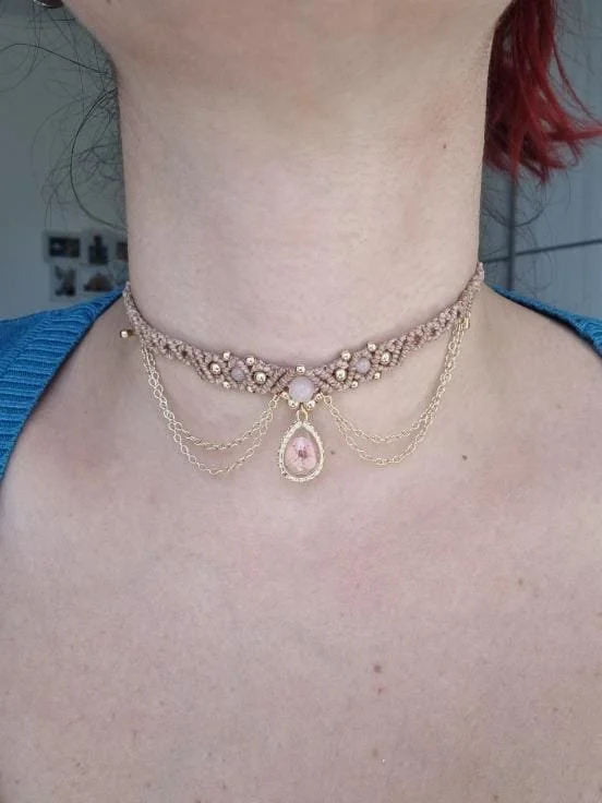 Questo romantico choker dedicato al meraviglioso fenomeno della fioritura dei ciliegi in Giappone, è realizzato a mano in macramè con filo color beige, pietre di Quarzo rosa e ciondolo a goccia in vetro con fiore vero.